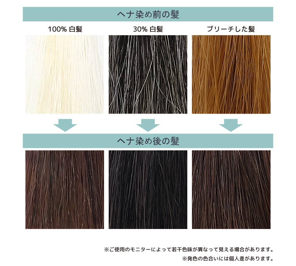 ※発色の色合いには個人差があります。 〜仕上がり状態〜 ※ペーストを長時間塗布した場合、又は継続利用していくと黒髪部分がトーンダウンすることがあります。白髪は生えてきた部分のみのリタッチ染めをされるとトーンダウンはある程度軽減されます。 | |||||||||||||||